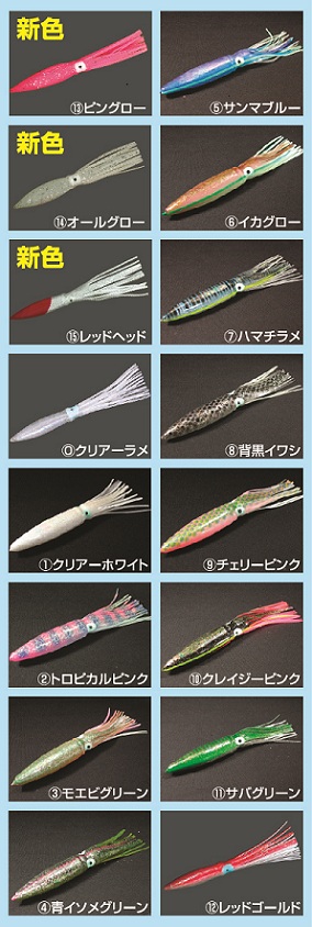 イカメタルゲ-ムのニュ-アイテム!! あらゆるイカに効果抜群!!。 ●フリ-フォ-ルでは、素早くボトムまたは棚に到達し、軽くラインテンションをかけてフォ-ルさせると、水平姿勢を保ちながらスロ-フォ-ル! ●イカベイトのソフトタッチとヒラヒラの足がアピ-ルし、イカが抱いて離さない! ●簡単にカラ-チェンジ(着せ替え)可能。 ●タルイカ(ソデイカ)ジギングに対応した強化カンナ針を搭載したサイズは、5号 110g・6.5号 170g・6.5号 210g カラーは16色| サイズ | 全長 | ウェイト (号数) | 希望小売単価 (税抜き) |